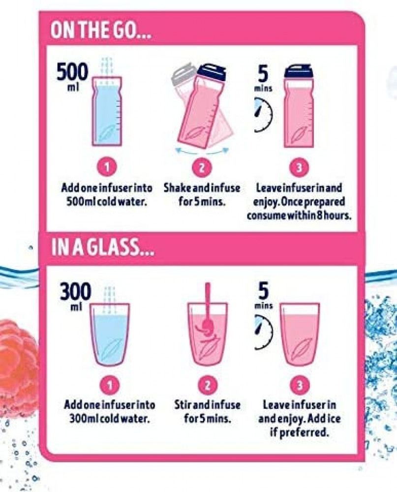 ضع كيس واحد داخل قنينة الماء (500 مل) واتركها لمدة 5 إلى 7 دقائق ثم قم برج القنينة جيداً لانتشار النكهة واستمتع بماء منعش وزاكي.