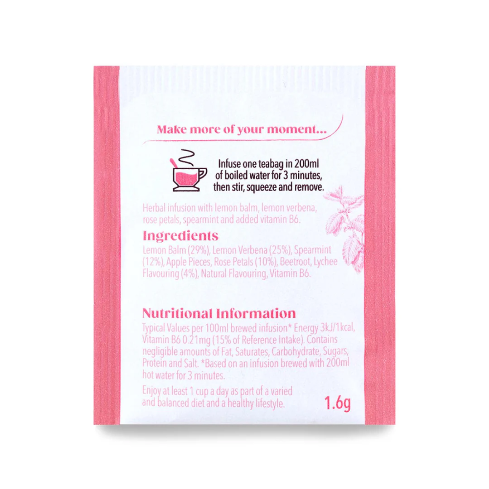 بلسم الليمون (29٪) ، لويزة الليمون (25٪) ، النعناع (12٪) ، قطع التفاح ، بتلات الورد (10٪) ، الشمندر ، نكهة الليتشي (4٪) ، فيتامين ب 6 ، منكهات طبيعية.