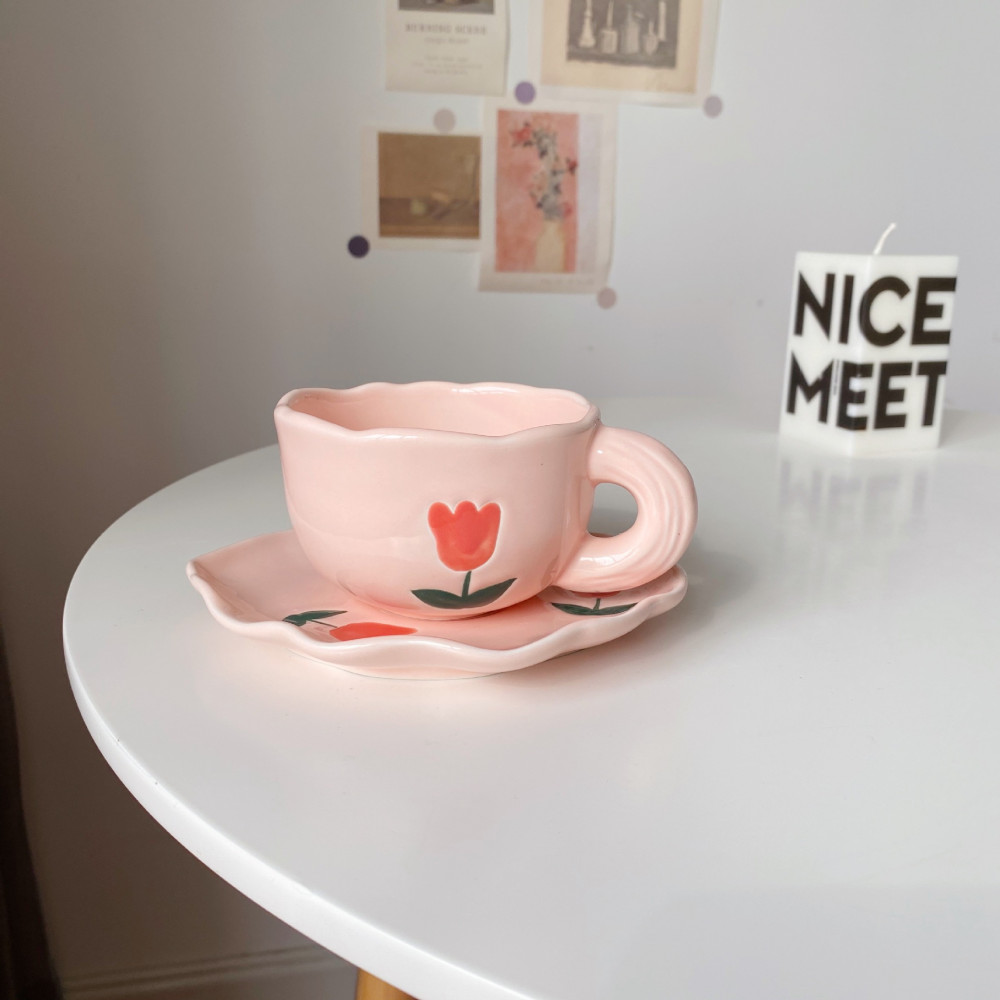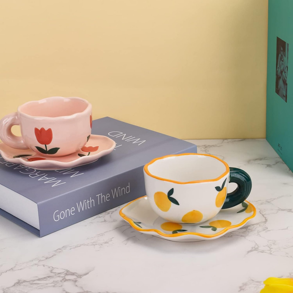 كوب سيراميك يدوي مع صحن برسومات يدوية جميلة