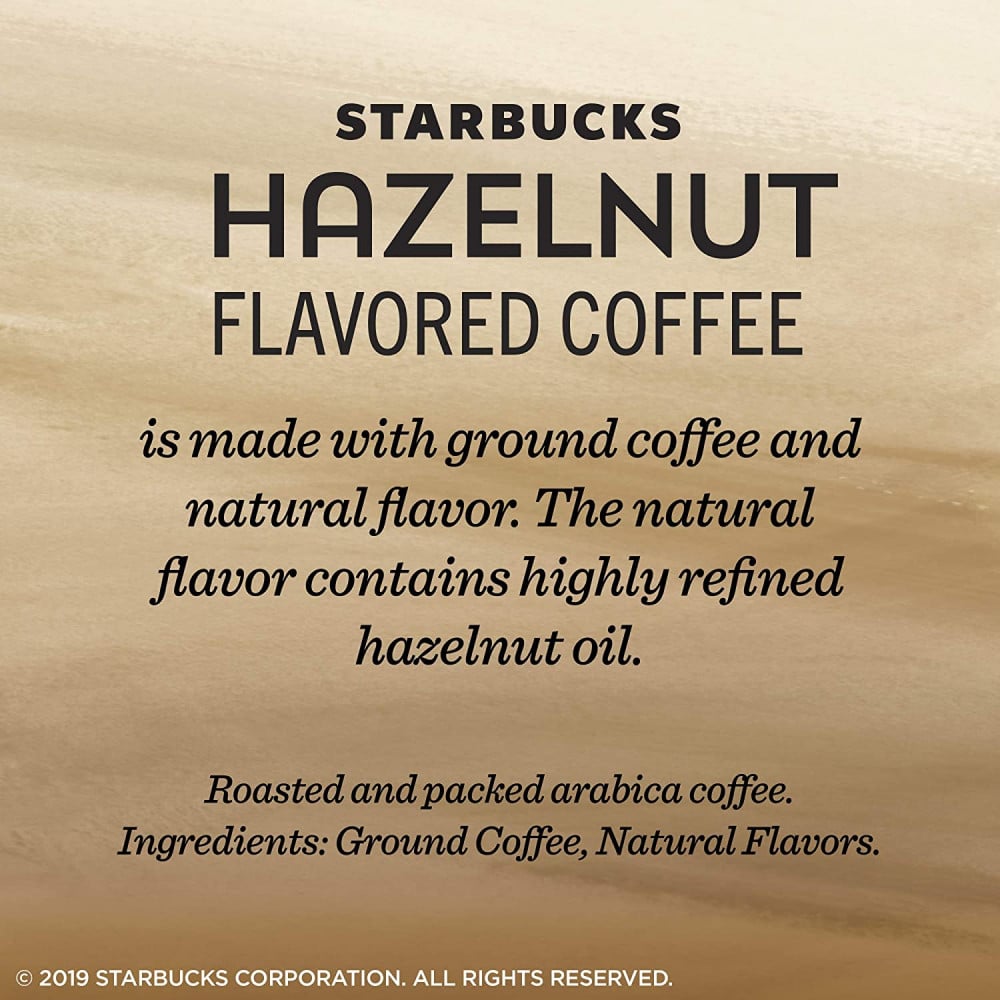 Starbucks Hazelnut Ground Coffee is made with ground coffee and natural flavor. The natural flavor contains highly refined hazelnut oil.