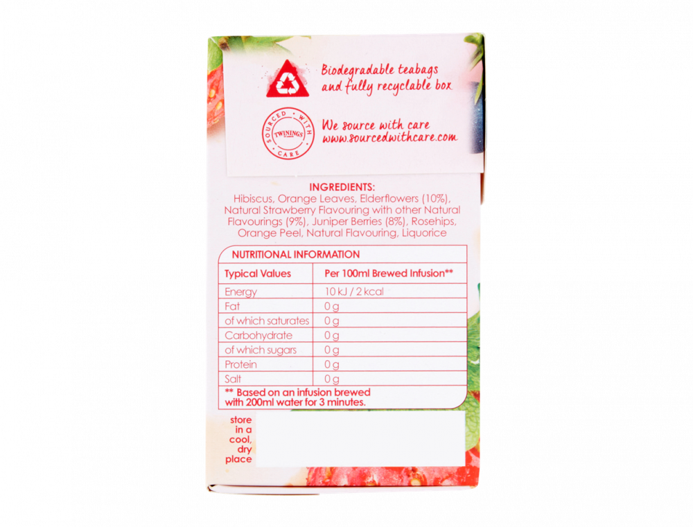 Hibiscus, orange leaf, elderflower (10%), natural strawberry flavor with other natural flavors (9%), juniper berry (8%), rosehip, orange peel, natural flavorings, licorice.