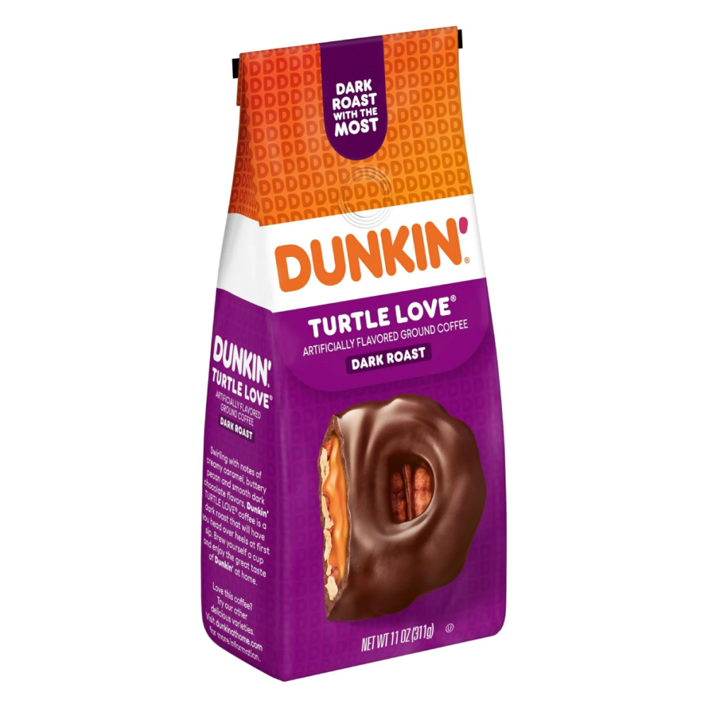 Have you ever felt love at first sight with a cup of coffee? If not, you clearly haven't tasted Dunkin' Turtle Love® Coffee. Featuring creamy caramel, buttery pecan and smooth dark chocolate notes, Turtle Love is a dark roast coffee that will have you falling in love with it from the first sip. And its ground form makes it easy to brew by the cup or carafe using any coffee maker - perfect for enjoying the great taste of Dunkin' Coffee in your kitchen. It's a flavor you're sure to love.