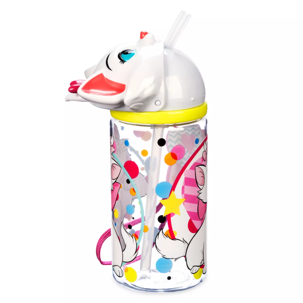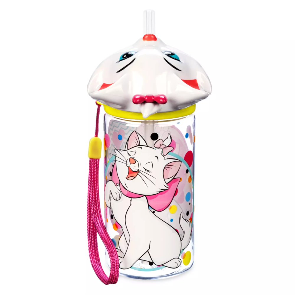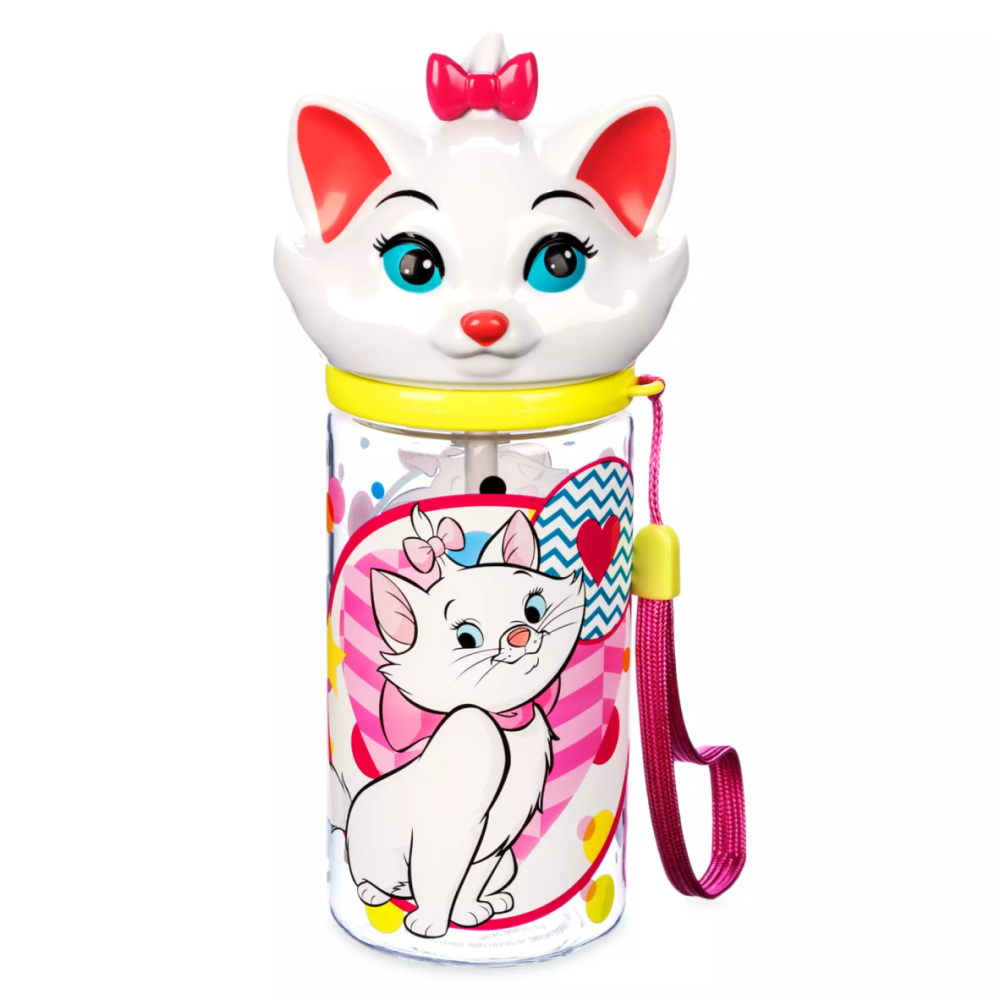 The sculpted design features the Aristocat cat's head molded into a lid, with 3D ears that slide up to reveal a built-in straw. The clear body perfectly features the cute cat while the included wrist strap makes it great for on-the-go drinking.