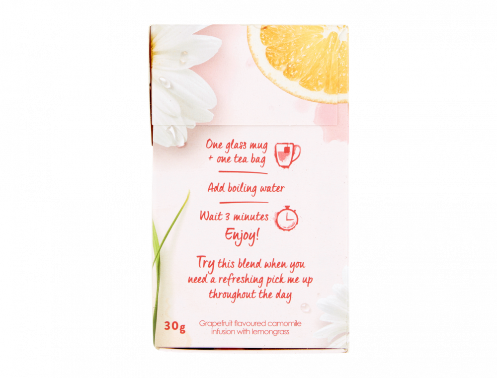 Juicy grapefruit blends with delicate chamomile blossoms making for a refreshing and lively blend.