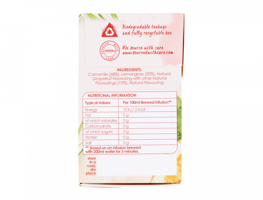 Chamomile (68%), Lemongrass (20%), Natural Grapefruit Flavor with Other Natural Flavors (10%), Natural Flavorings.