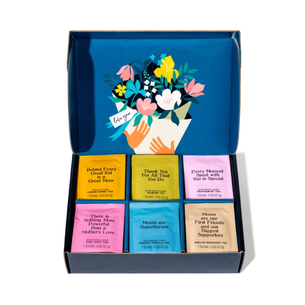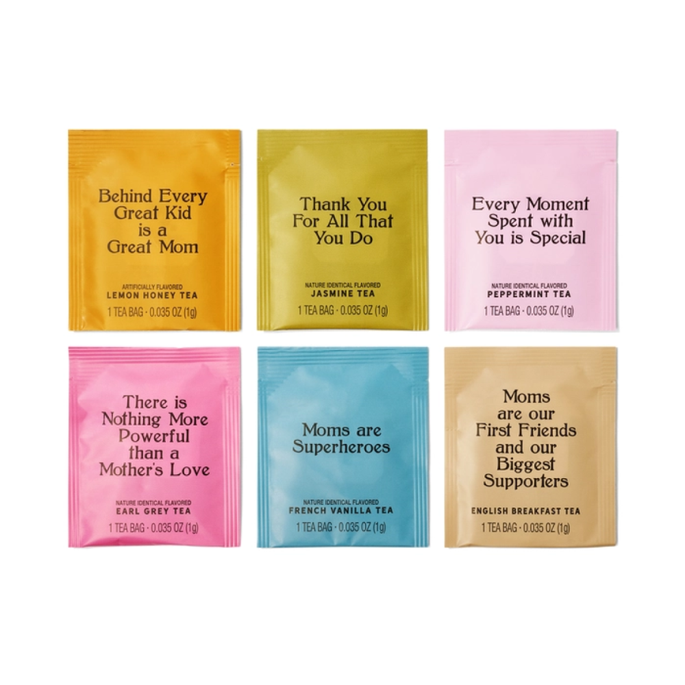Show your mom some love with this unique Best Mom Ever 90 tea bag set to show her how much you appreciate her. Each individually wrapped tea bag features a heartfelt translation and quote for women. With 6 flavors (French Vanilla, Honey Lemon, Jasmine, Peppermint, Earl Grey, and English Breakfast) and 15 tea bags per style, this sophisticated set makes a great Mother's Day, Mom's Birthday, or New Year's gift.