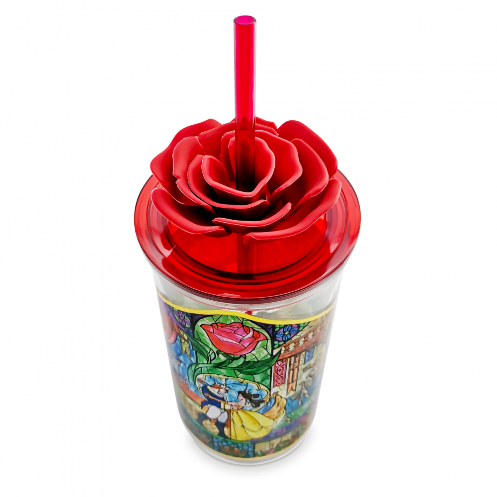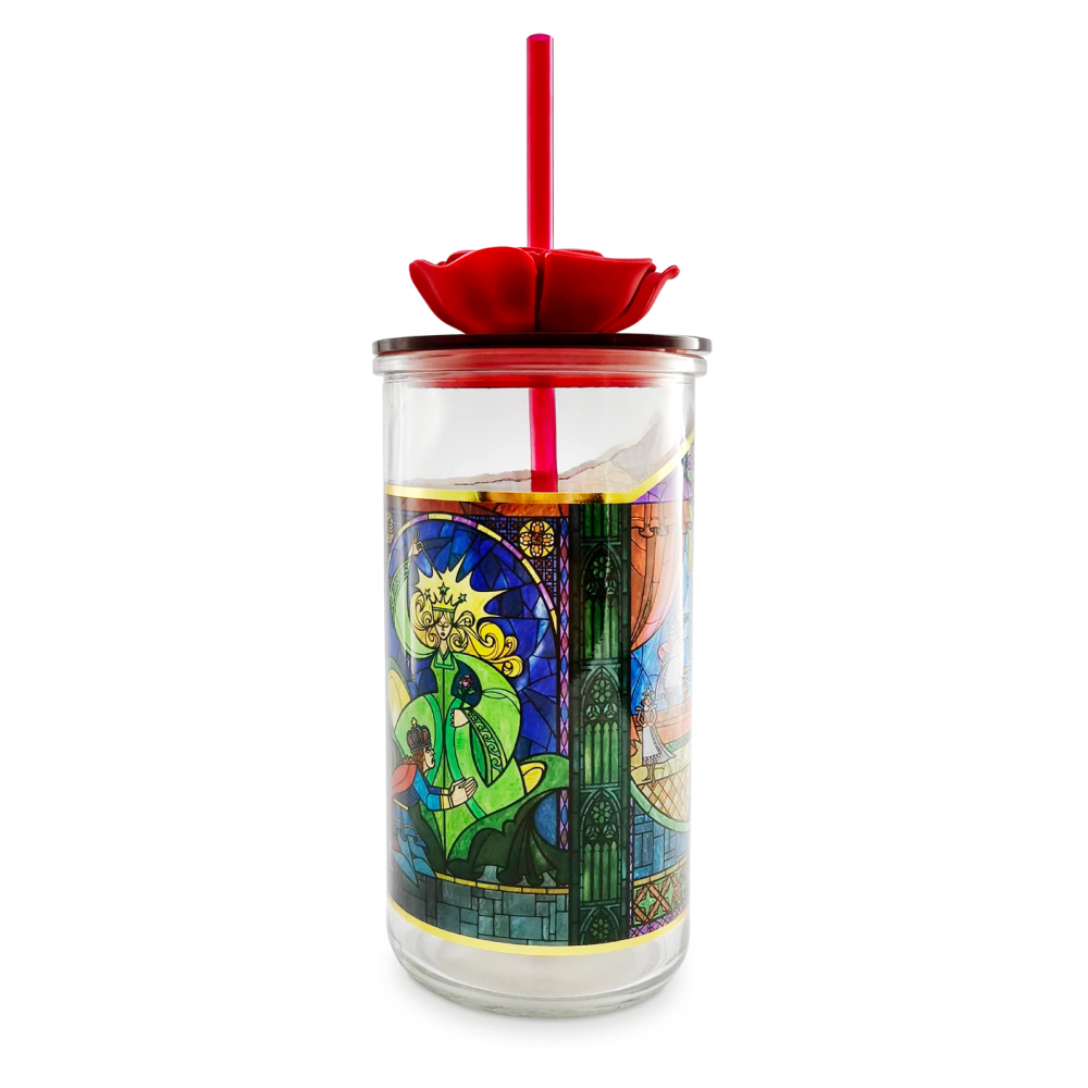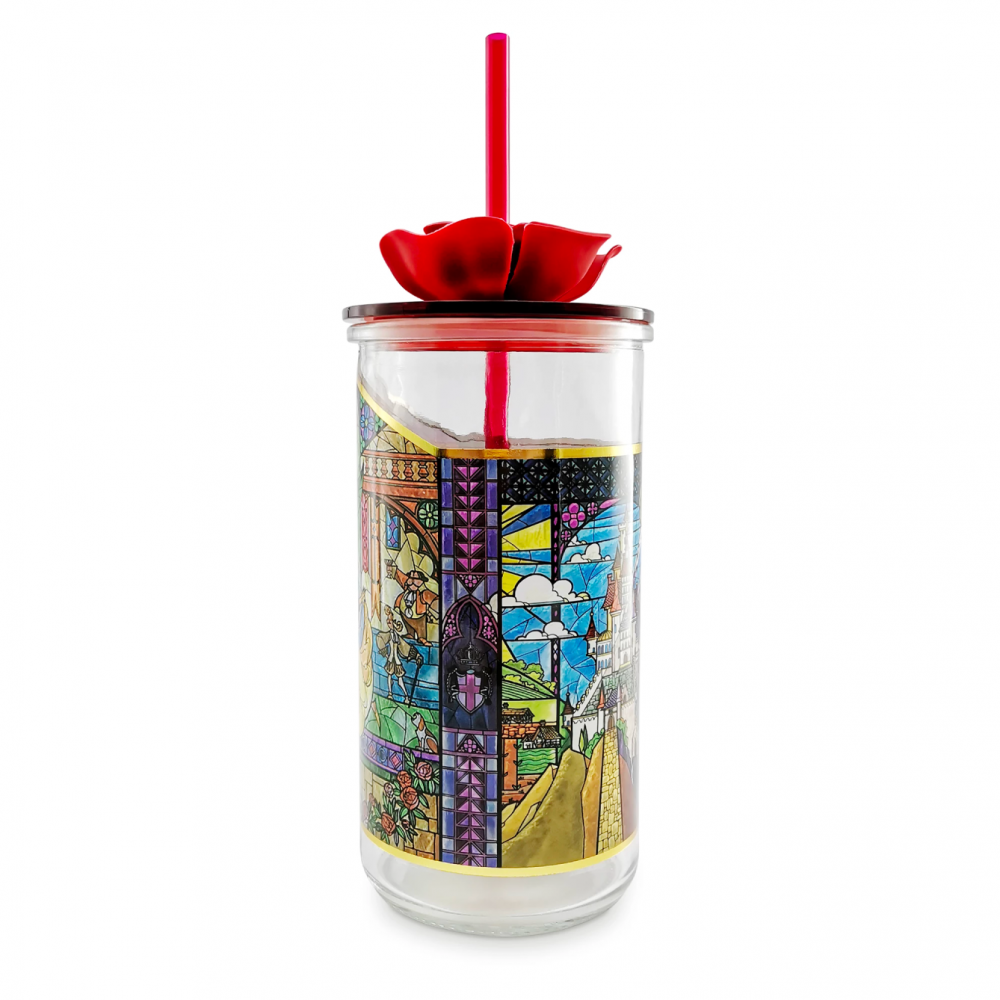 An elegant glass mug with a colorful glass pattern with a distinctive lid in a romantic rose red design