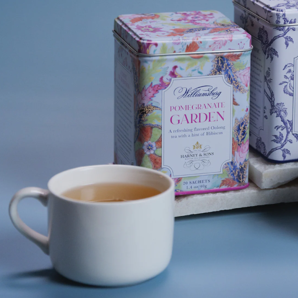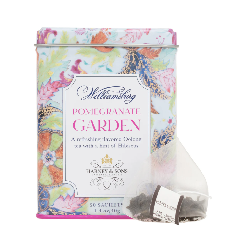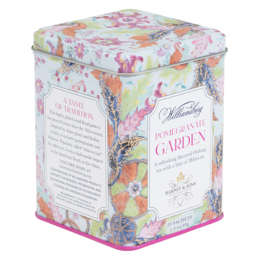 The newest addition to the Williamsburg collection, Pomegranate Garden Tea brings a level of sophistication blended with sweet and tart notes of pomegranate and hibiscus flavors. This vibrant and precious floral pattern has graced homes since the 18th century. Inspired by Asian botanicals and Indian textiles, it featured pomegranates and hibiscus.